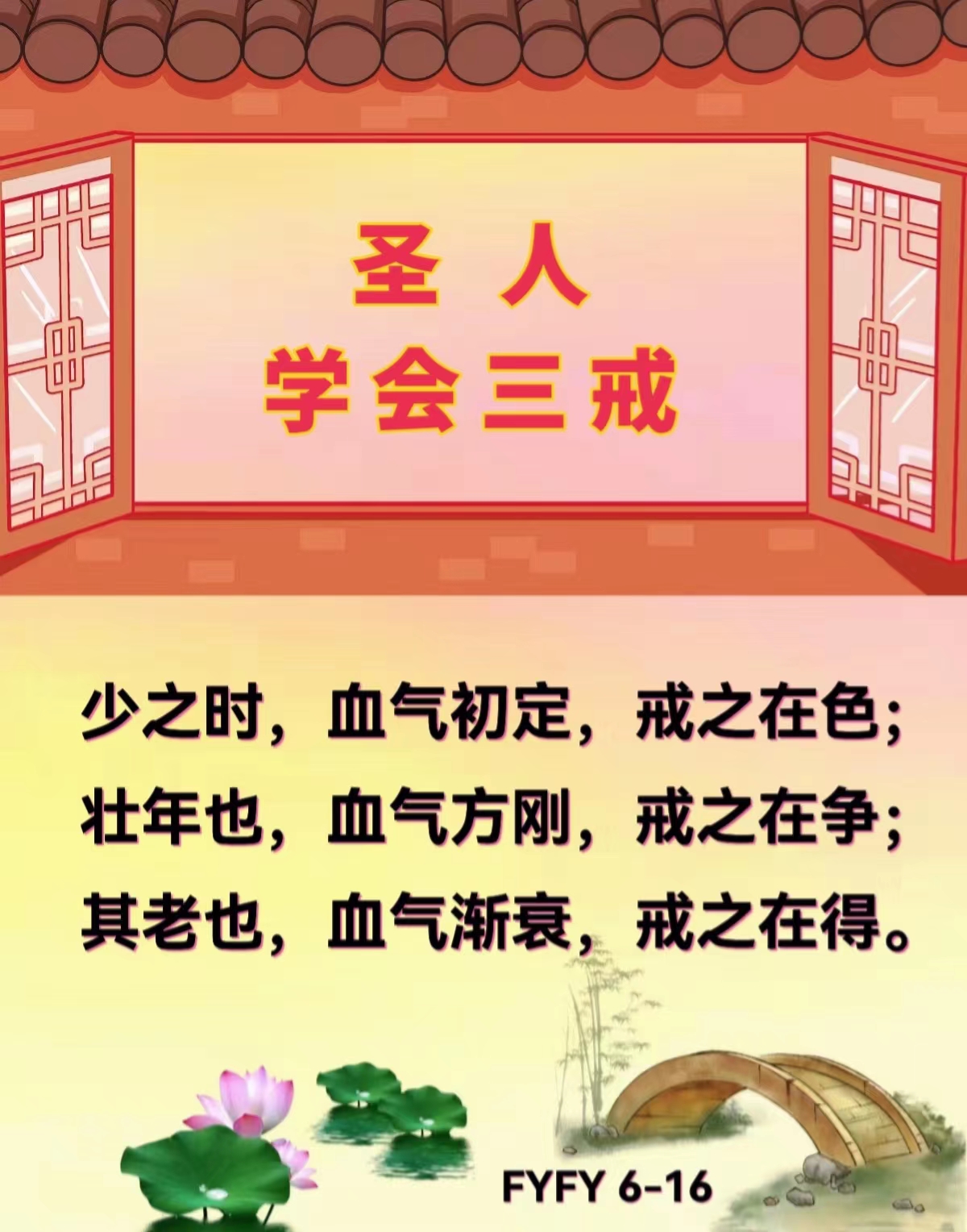 圣人学会三戒:少之时,血气初定,戒之在色;壮年也,血气方刚,戒之在争;其老也,血气渐衰,戒之在得。