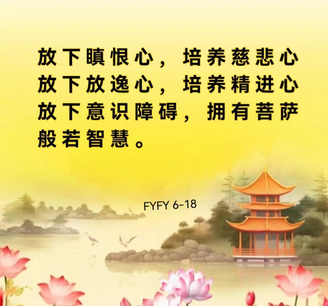 放下瞋恨心,培养慈悲心;放下放逸心,培养精进心;放下意识障碍,拥有菩萨般若智慧。