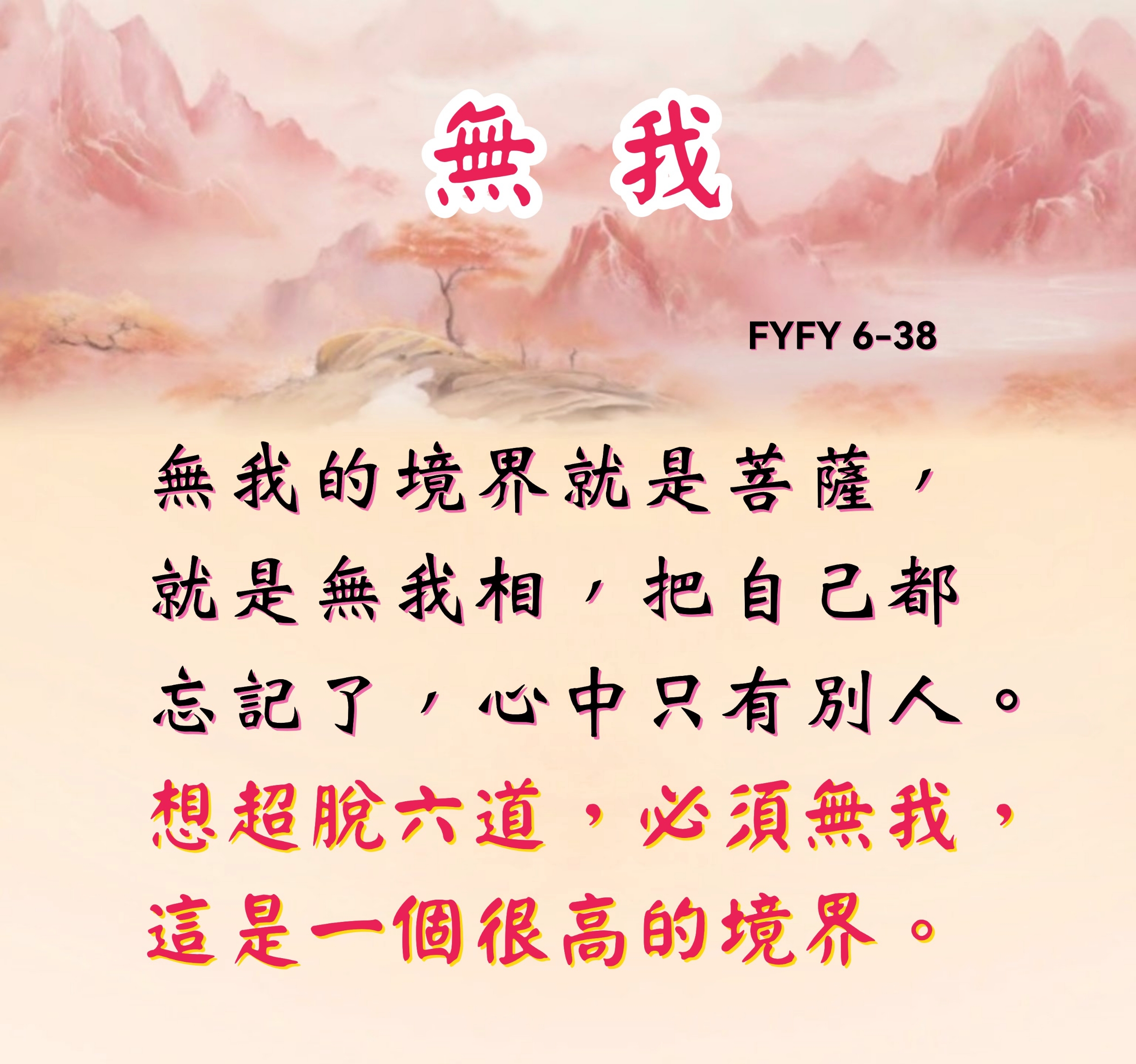 无我的境界就是菩萨,就是无我相,把自己都忘记了,心中只有别人。想超脱六道,必须无我,这是一个很高的境界。