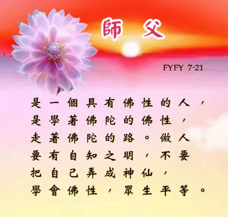 师父是一个具有佛性的人,是学着佛陀的佛性,走着佛陀的路。做人要有自知之明,不要把自己弄成神仙,学会佛性,众生平等。