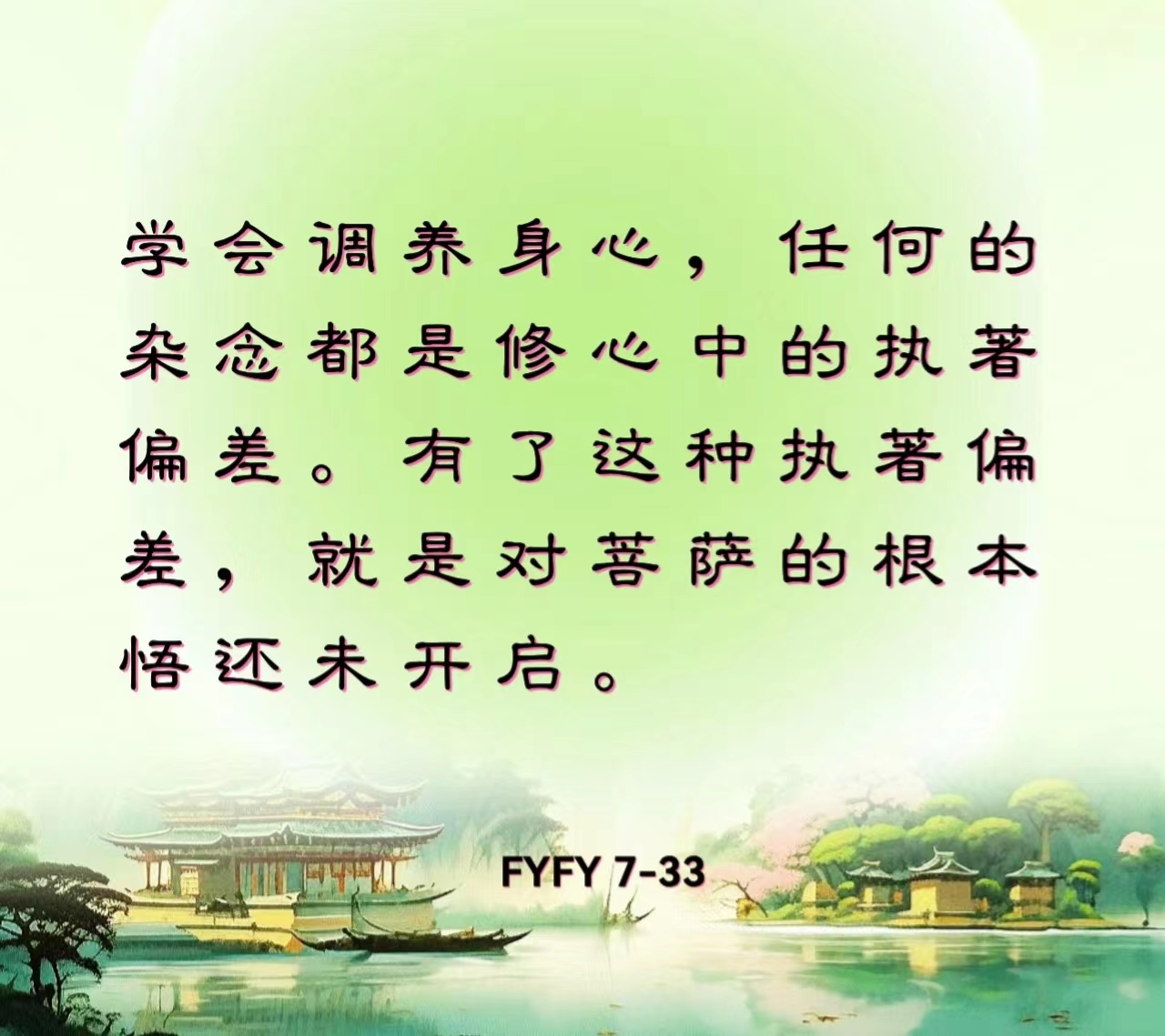 学会调养身心,任何的杂念都是修心中的执著偏差。有了这种执著偏差,就是对菩萨的根本悟还未开启。