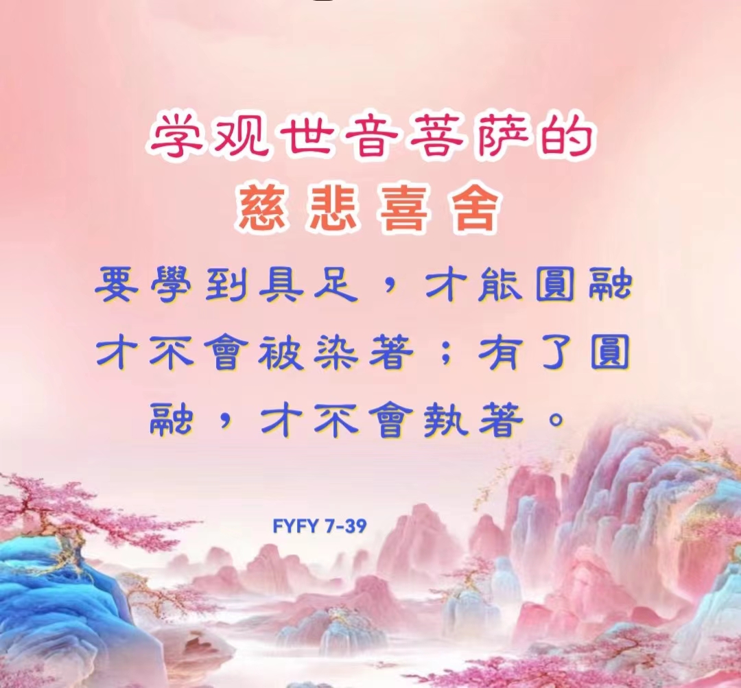 学观世音菩萨的慈悲喜舍要学到具足,才能圆融,才不会被染着;有了圆融,才不会执著。