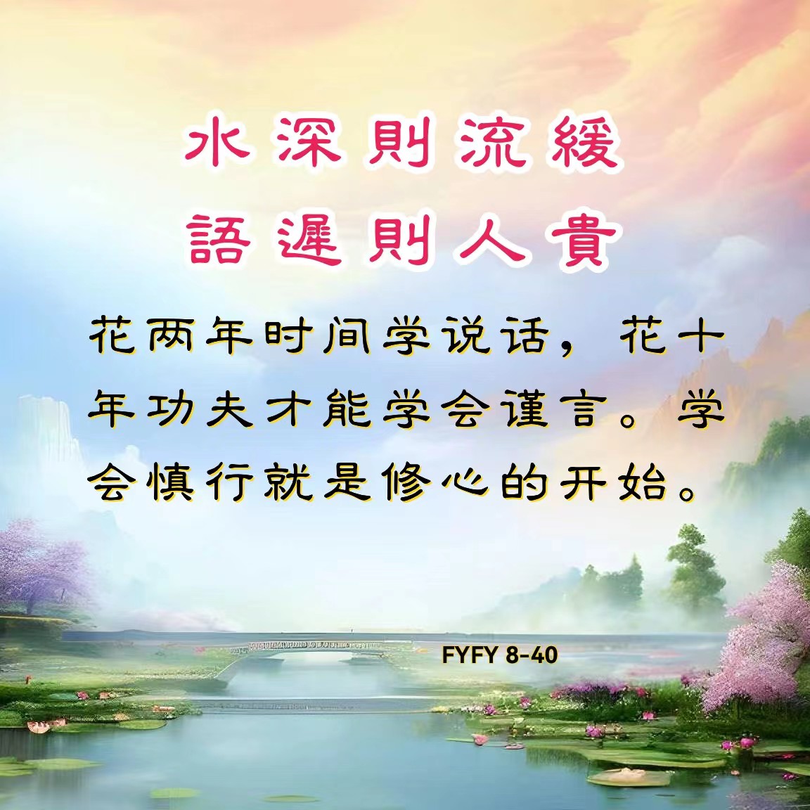 水深则流缓,语迟则人贵。花两年时间学说话,花十年功夫才能学会谨言。学会慎行就是修心的开始。