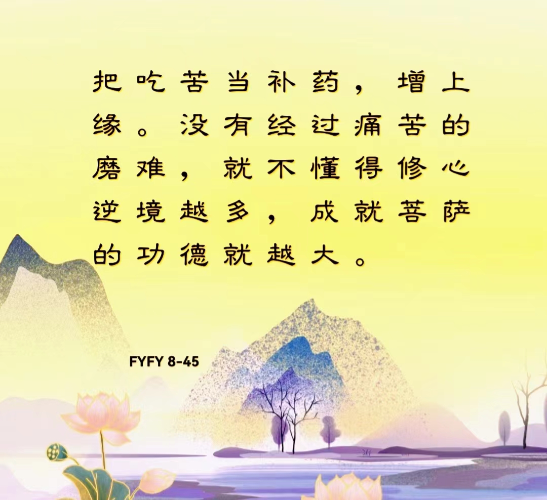 把吃苦当补药,增上缘。没有经过痛苦的磨难,就不懂得修心;逆境越多,成就菩萨的功德就越大。