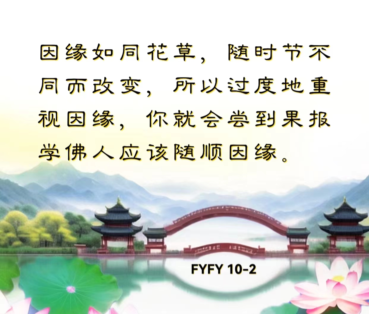 因缘如同花草,随时节不同而改变,所以过度地重视因缘,你就会尝到果报。学佛人应该随顺因缘。