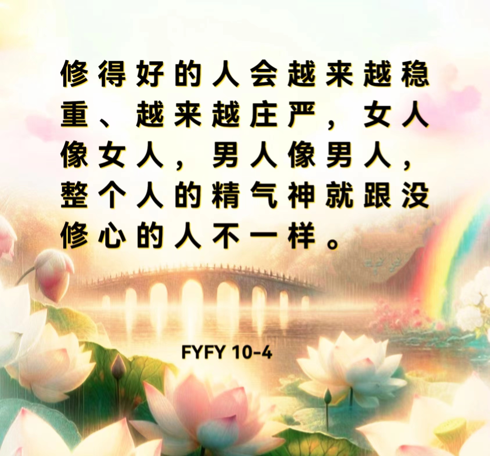 修得好的人会越来越稳重、越来越庄严,女人像女人,男人像男人,整个人的精气神就跟没修心的人不一样。