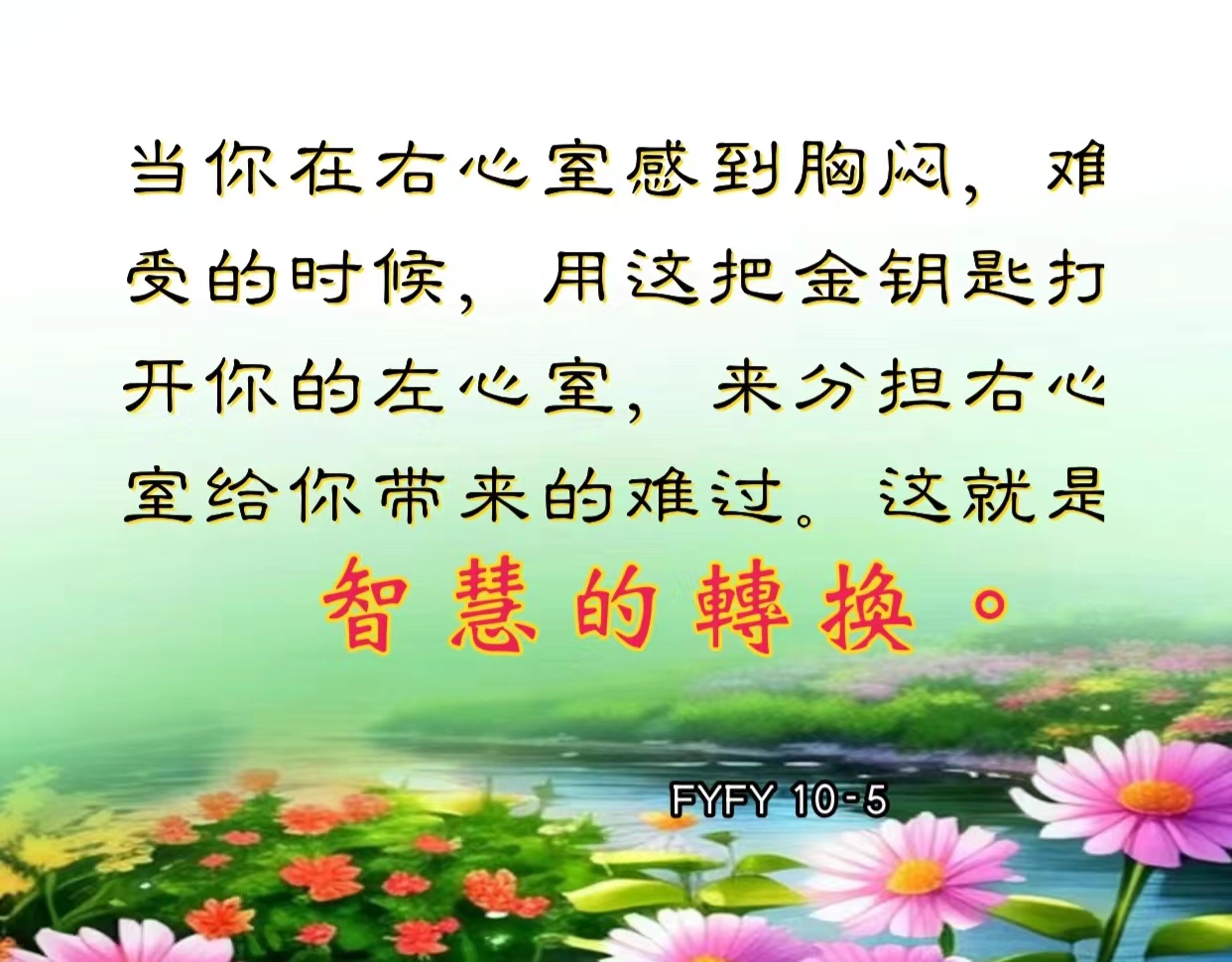 当你在右心室感到胸闷、难受的时候,用这把金钥匙打开你的左心室,来分担右心室给你带来的难过。这就是智慧的转换。