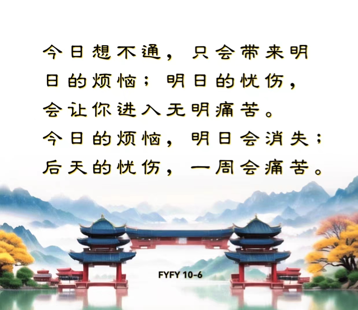 今日想不通,只会带来明日的烦恼;明日的忧伤,会让你进入无明痛苦。今日的烦恼,明日会消失;后天的忧伤,一周会痛苦。