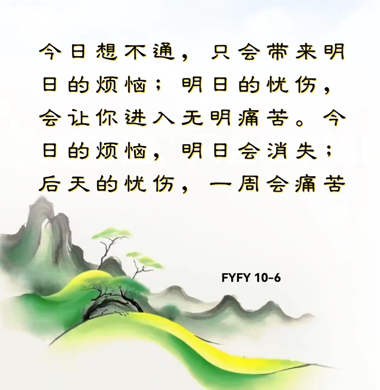 今日想不通,只会带来明日的烦恼;明日的忧伤,会让你进入无明痛苦。今日的烦恼,明日会消失;后天的忧伤,一周会痛苦。