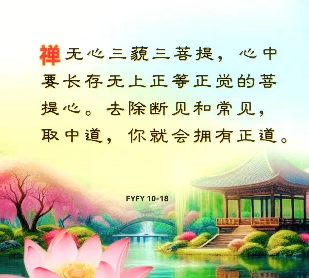 禅无心三藐三菩提,心中要长存无上正等正觉的菩提心。去除断见和常见,取中道,你就会拥有正道。