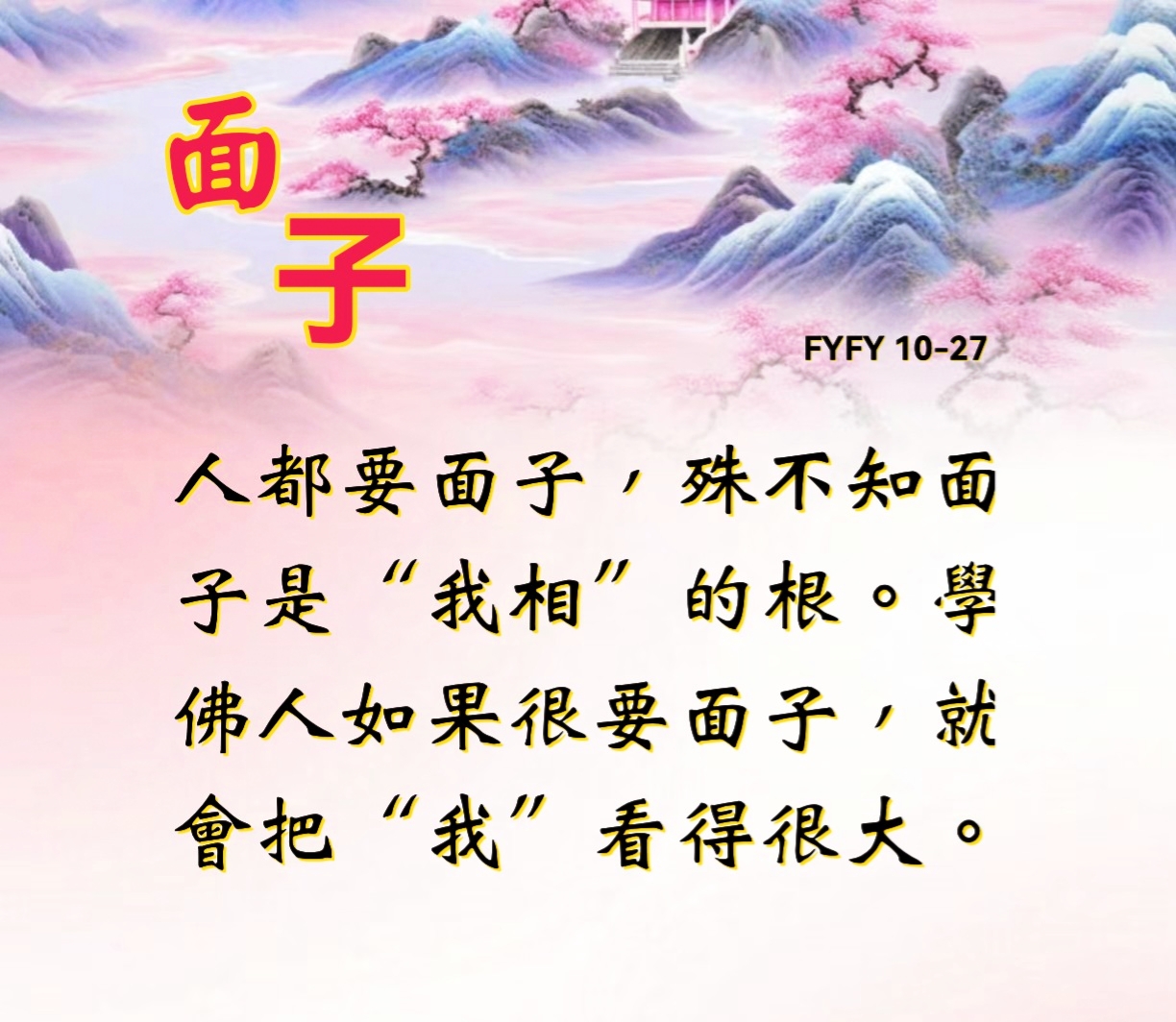 人都要面子,殊不知面子是“我相”的根。学佛人如果很要面子,就会把“我”看得很大。
