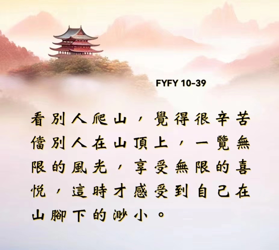 看别人爬山,觉得很辛苦;当别人在山顶上,一览无限的风光,享受无限的喜悦,这时才感受到自己在山脚下的渺小。
