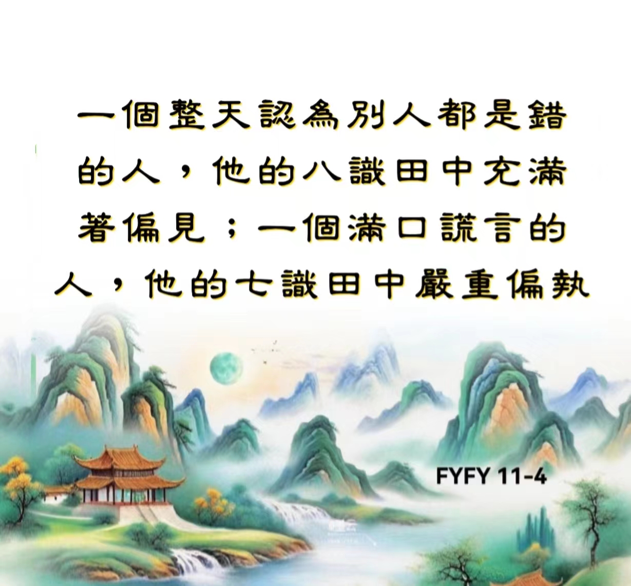 一个整天认为别人都是错的人,他的八识田中充满着偏见;一个满口谎言的人,他的七识田中严重偏执。