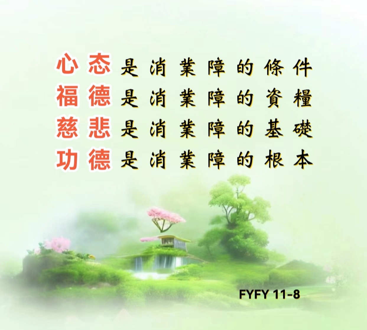 心态是消业障的条件,福德是消业障的资粮,慈悲是消业障的基础,功德是消业障的根本。