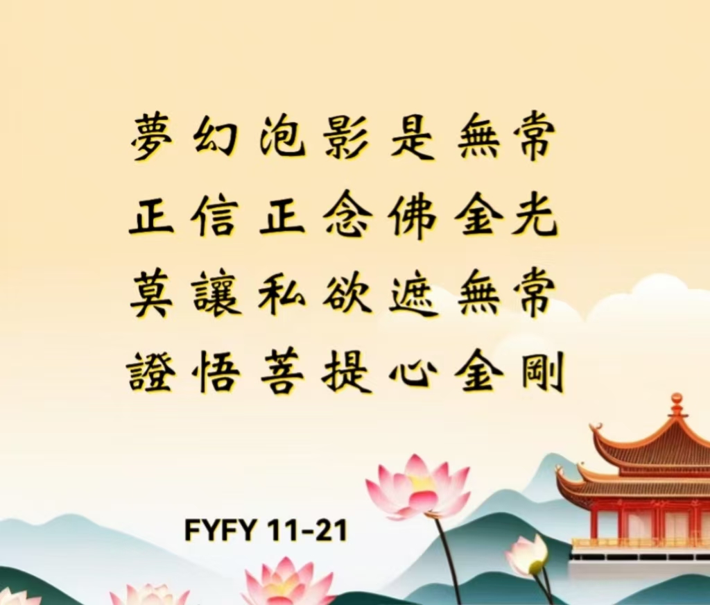 夢幻泡影是無常,正信正念佛金光。莫讓私欲遮無常,證悟菩提心金剛。