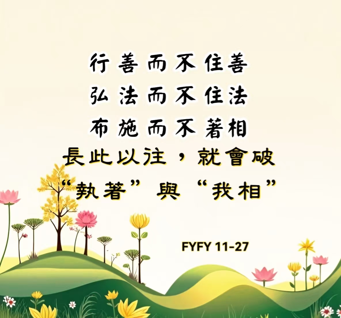 行善而不住善,弘法而不住法,布施而不著相。長此以往,就會破“執著”與“我相”。