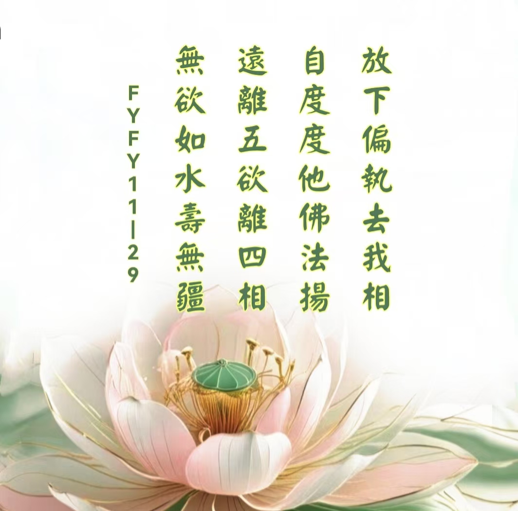 放下偏執去我相,自度度他佛法揚。遠離五欲離四相,無欲如水壽無疆。
