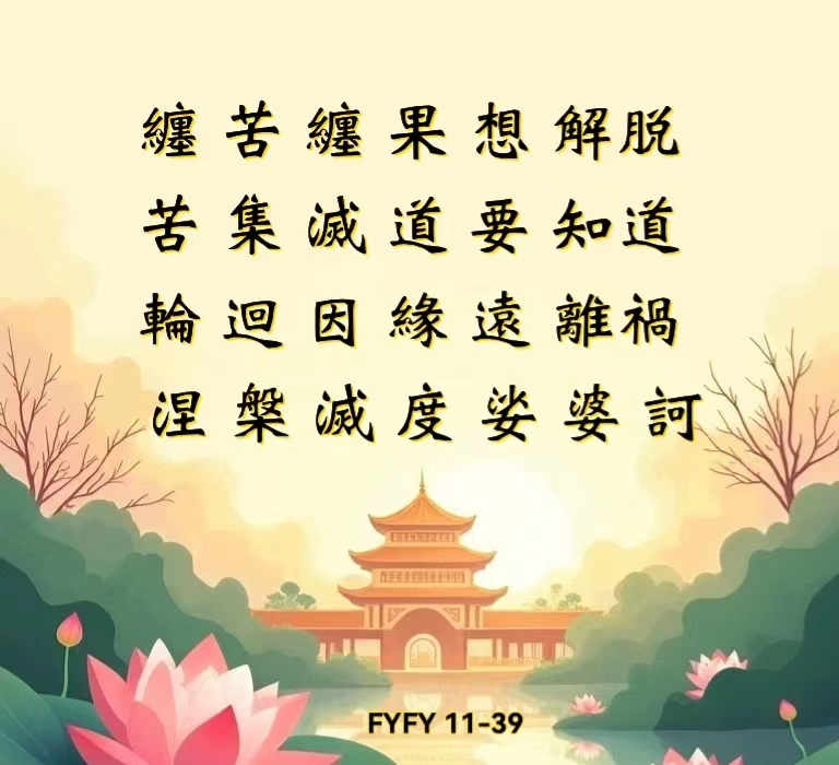 纏苦纏果想解脫,苦集滅道要知道。輪迴因緣遠離禍,涅槃滅度娑婆訶。