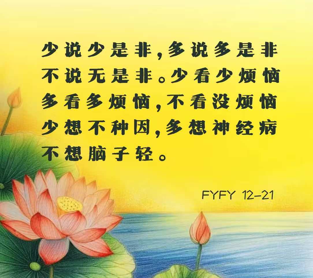 少说少是非,多说多是非,不说无是非。少看少烦恼,多看多烦恼,不看没烦恼,少想不种因,多想神经病,不想脑子轻。