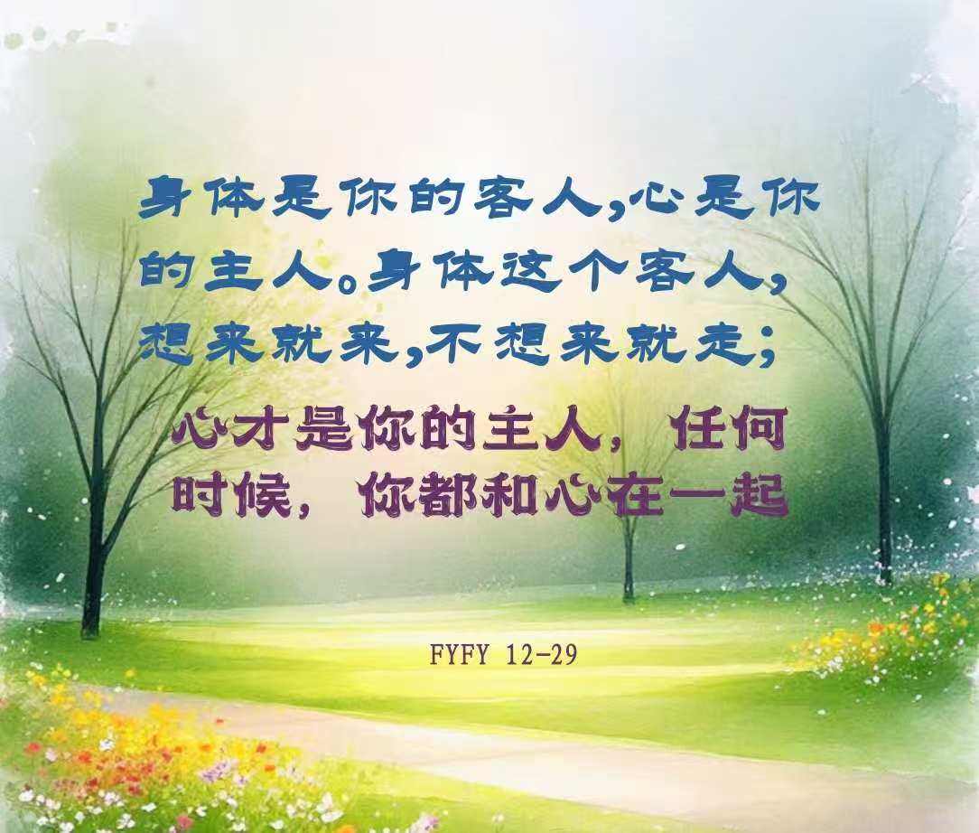 身体是你的客人,心是你的主人。身体这个客人,想来就来,不想来就走;心才是你的主人,任何时候,你都和心在一起。