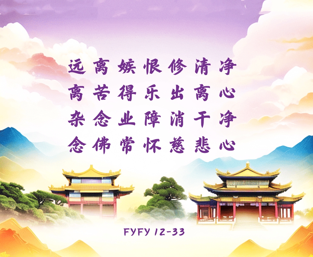 远离嫉恨修清净,离苦得乐出离心。杂念业障消干净,念佛常怀慈悲心。
