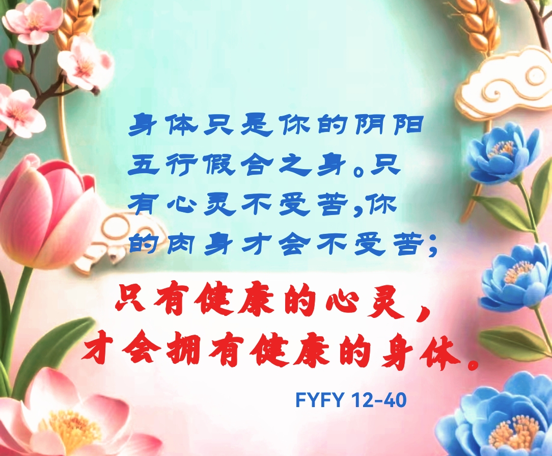 身体只是你的阴阳五行假合之身。只有心灵不受苦,你的肉身才会不受苦;只有健康的心灵,才会拥有健康的身体。