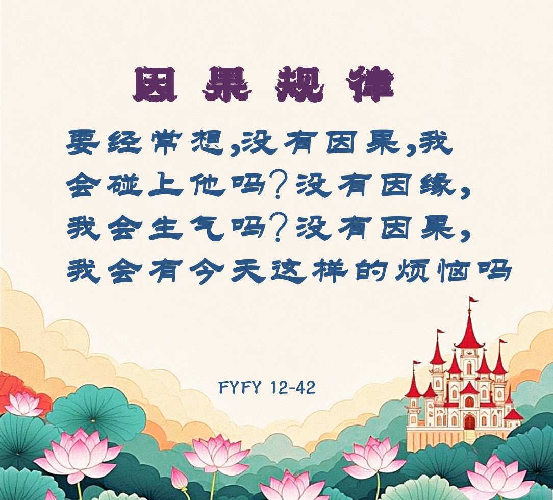 “因果规律”。要经常想,没有因果,我会碰上他吗?没有因缘,我会生气吗?没有因果,我会有今天这样的烦恼吗?