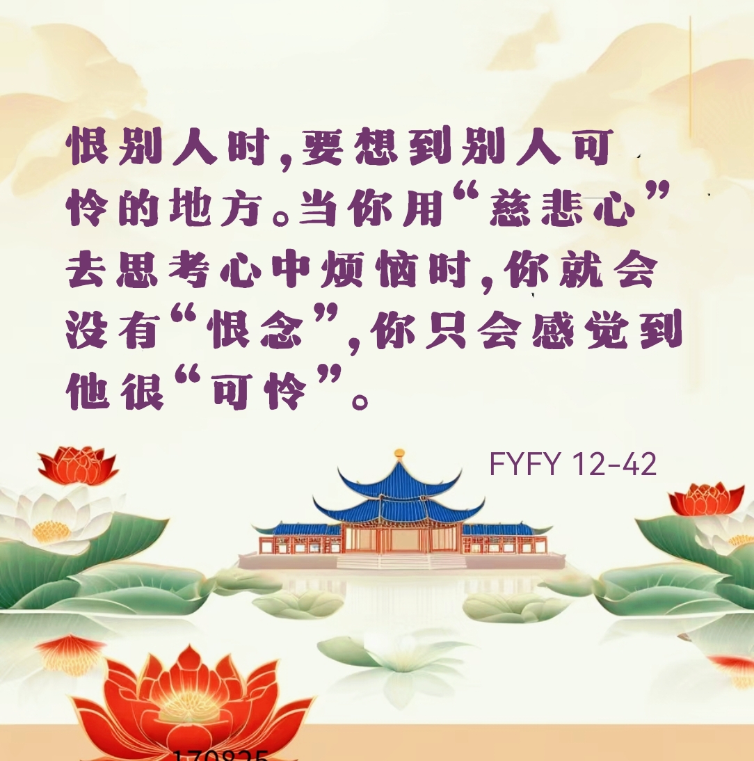 恨别人时,要想到别人可怜的地方。当你用“慈悲心”去思考心中烦恼时,你就会没有“恨念”,你只会感觉到他很“可怜”。