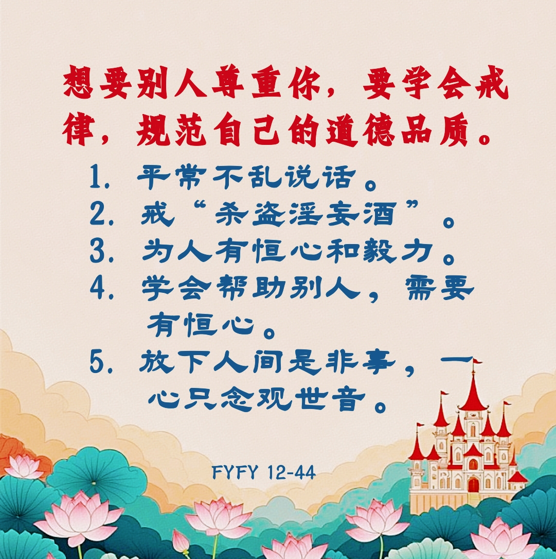 想要别人尊重你,要学会守戒律,规范自己的道德品质。 1. 平常不乱说话。 2. 戒“杀盗淫妄酒”。 3. 为人有恒心和毅力。 4. 学会帮助别人,需要有恒心。 5. 放下人间是非事,一心只念观世音。