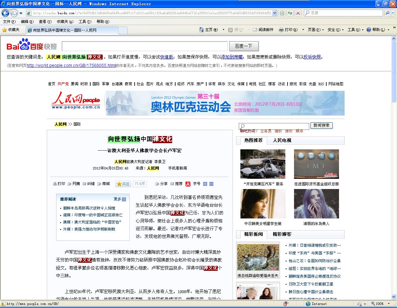 到悉尼采访,几次听到著名侨领项德宝先生谈起华人佛教学会会长、东方华语电台台长卢军宏以弘扬中国禅文化为己任,甘为人们的心灵导师,使社会上很多人的心理矛盾和烦恼迎刃而解。最近,记者对卢军宏会长进行了专访,发现他的世界佛光普照,广垠无际。