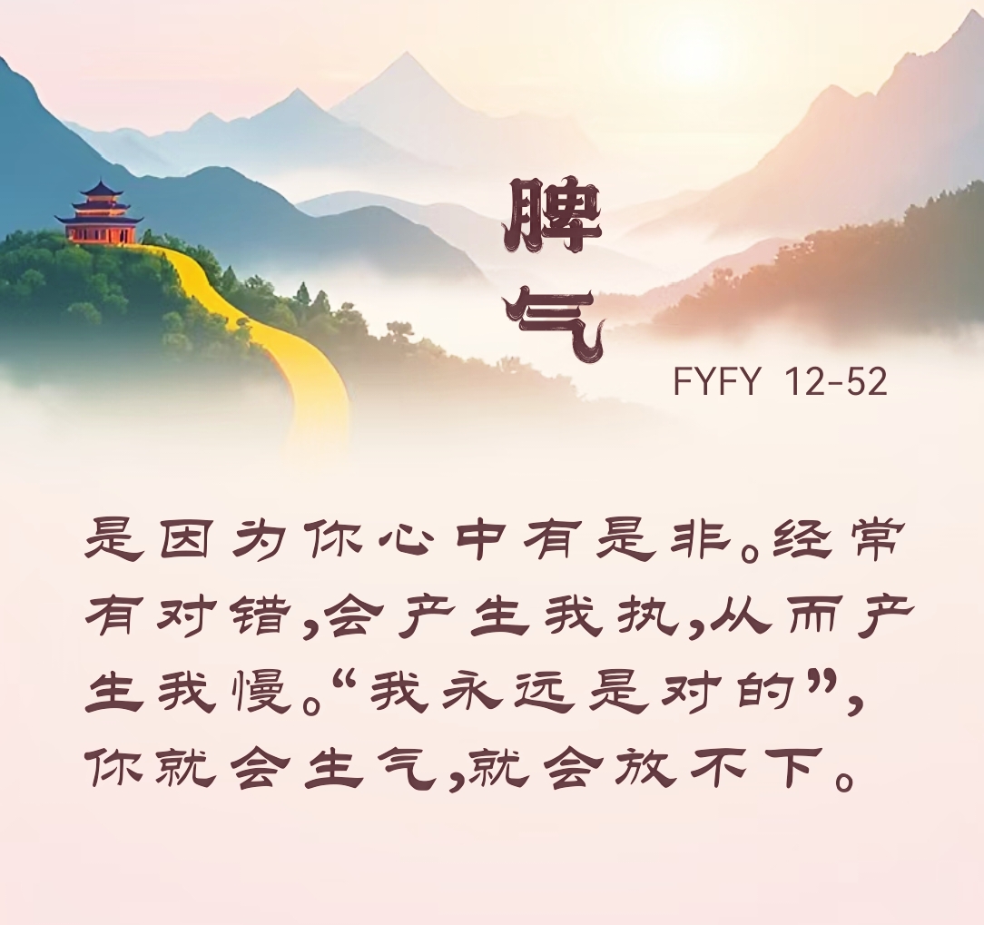 “脾气”是因为你心中有是非。经常有对错,会产生我执,从而产生我慢。“我永远是对的”,你就会生气,就会放不下。