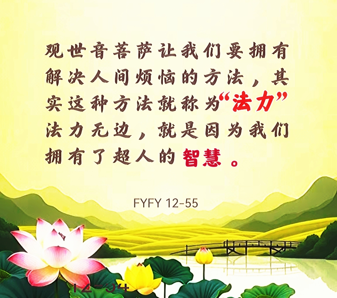观世音菩萨让我们要拥有解决人间烦恼的方法,其实这种方法就称为“法力”。法力无边,就是因为我们拥有了超人的智慧。