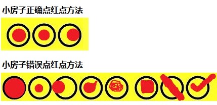 ● 不能打勾、不能涂出圈外、不能把圆圈涂满、只能点点儿。红点不能太小,太小会影响效果,红点要至少五分满到八分满(占圆圈的50%-80%)。(如图19)