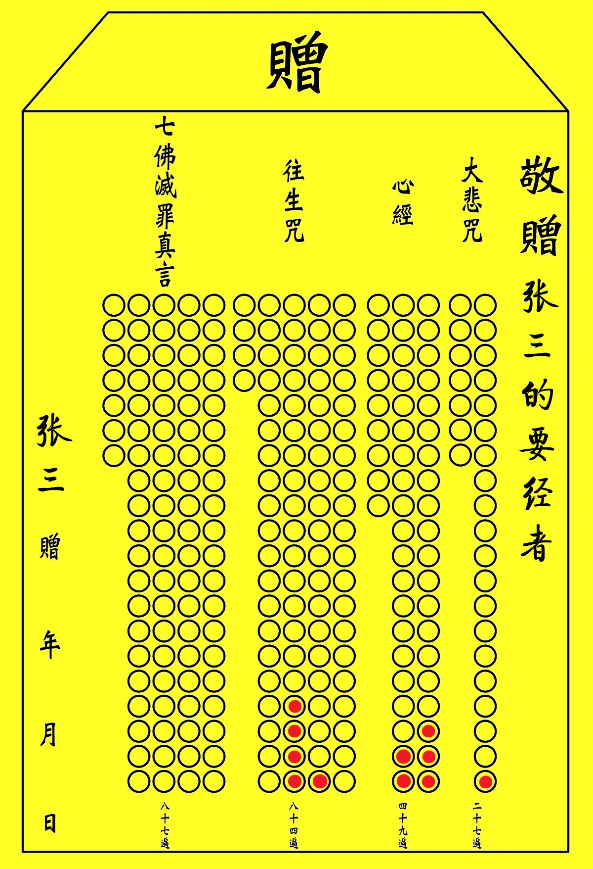 ● 每念完一遍经就用红笔在这部经相应的小圆圈内点一下,也可以念完多个或者全部念完后一起点。