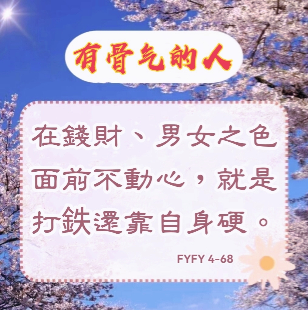 有骨气的人在钱财、男女之色面前不动心,就是打铁还需自身硬。